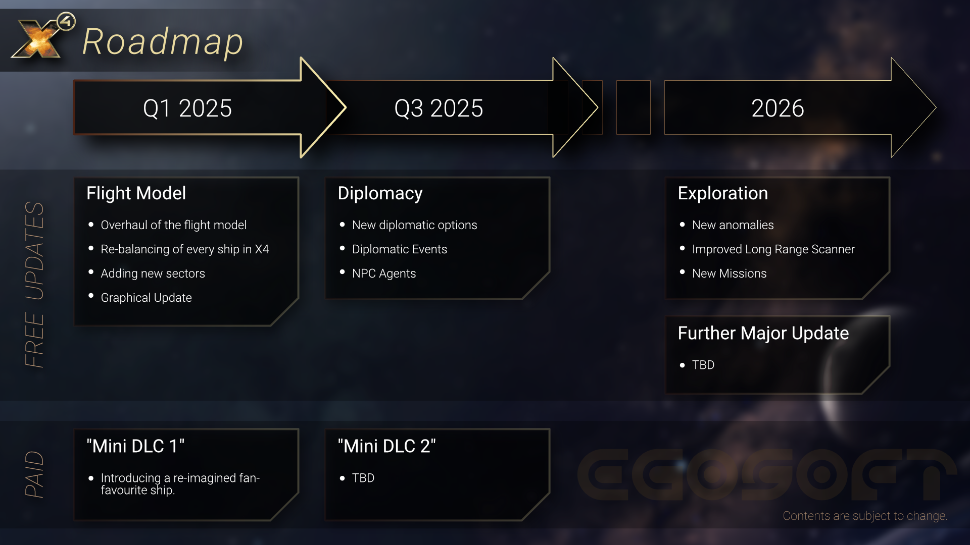 Flugmodell-Update und X4: Hyperion-Paket nun in euren Händen, wollt ihr sicher wissen, was für X4: Foundations als Nächstes ansteht. Unsere Roadmap zur Entwicklung ist gespickt mit aufregenden Features, und das könnt ihr in naher Zukunft erwarten: